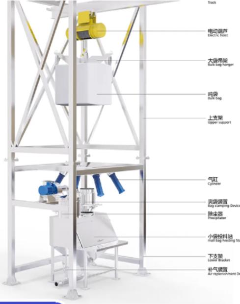 1、設(shè)備支架及護板;2、電動葫蘆;3、噸袋吊架;4、夾袋裝置;5、拍打、振動、磁選裝置;6、緩沖料倉;